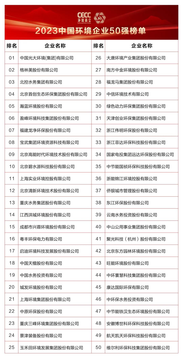 “2025中国环境企业50强”榜单,以企业申报为基础,以公正公开为原则,以真实数据为依据,结合上规模环境企业调研,按照2023年度营业收入总额降序排列产生。其中,以环境为主营业务的上市公司按已公布的2024年报营收数据为准;非环境类上市公司按年报中环境业务营收数据为准;非上市公司以专业第三方机构提供的环境业务营收数据证明为准。同时,如某公司营收数据已计入母公司参评的,则此公司不再参评,以避免出现重复计数的情况。